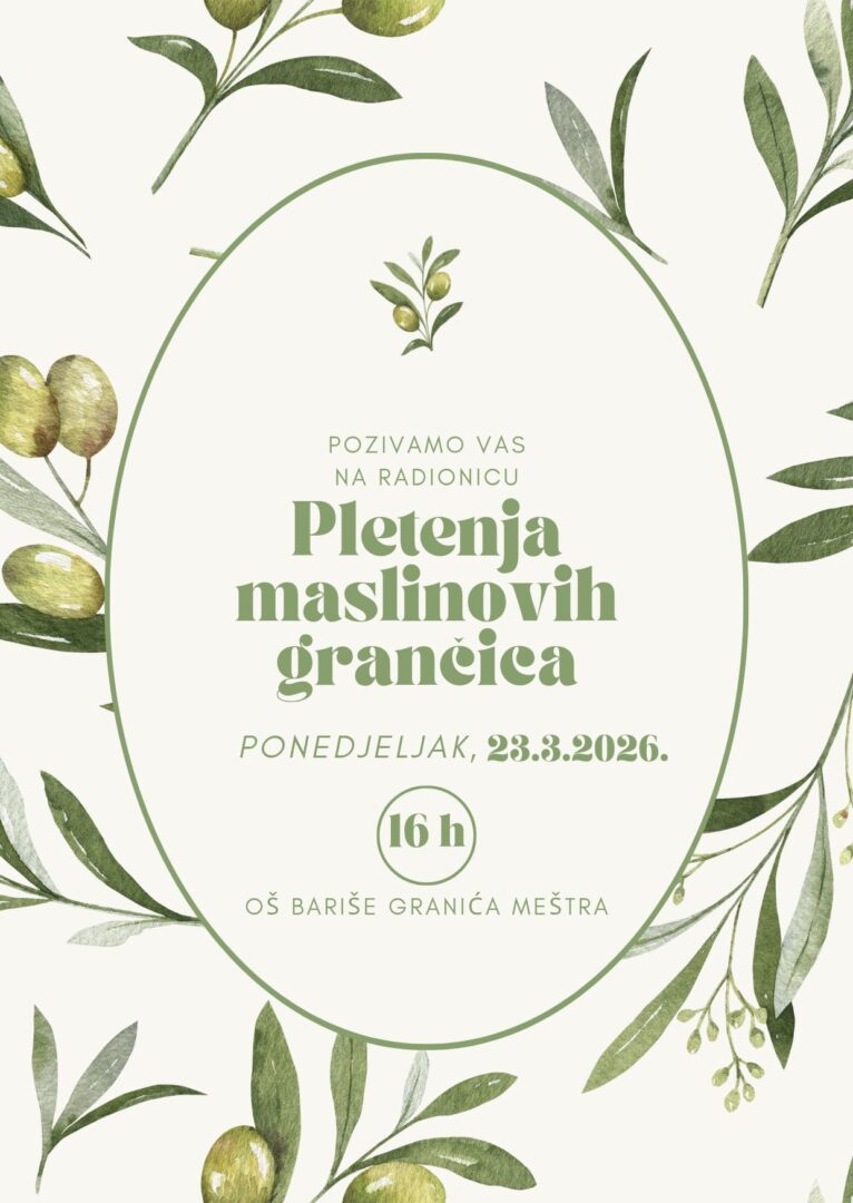 Pozivamo učenike, roditelje i djelatnike na radionicu pletenja maslinovih grančica u OŠ Bariše Granića Meštra. Radionica počinje u 16:00 sati i održat će se u prostorijama škole.