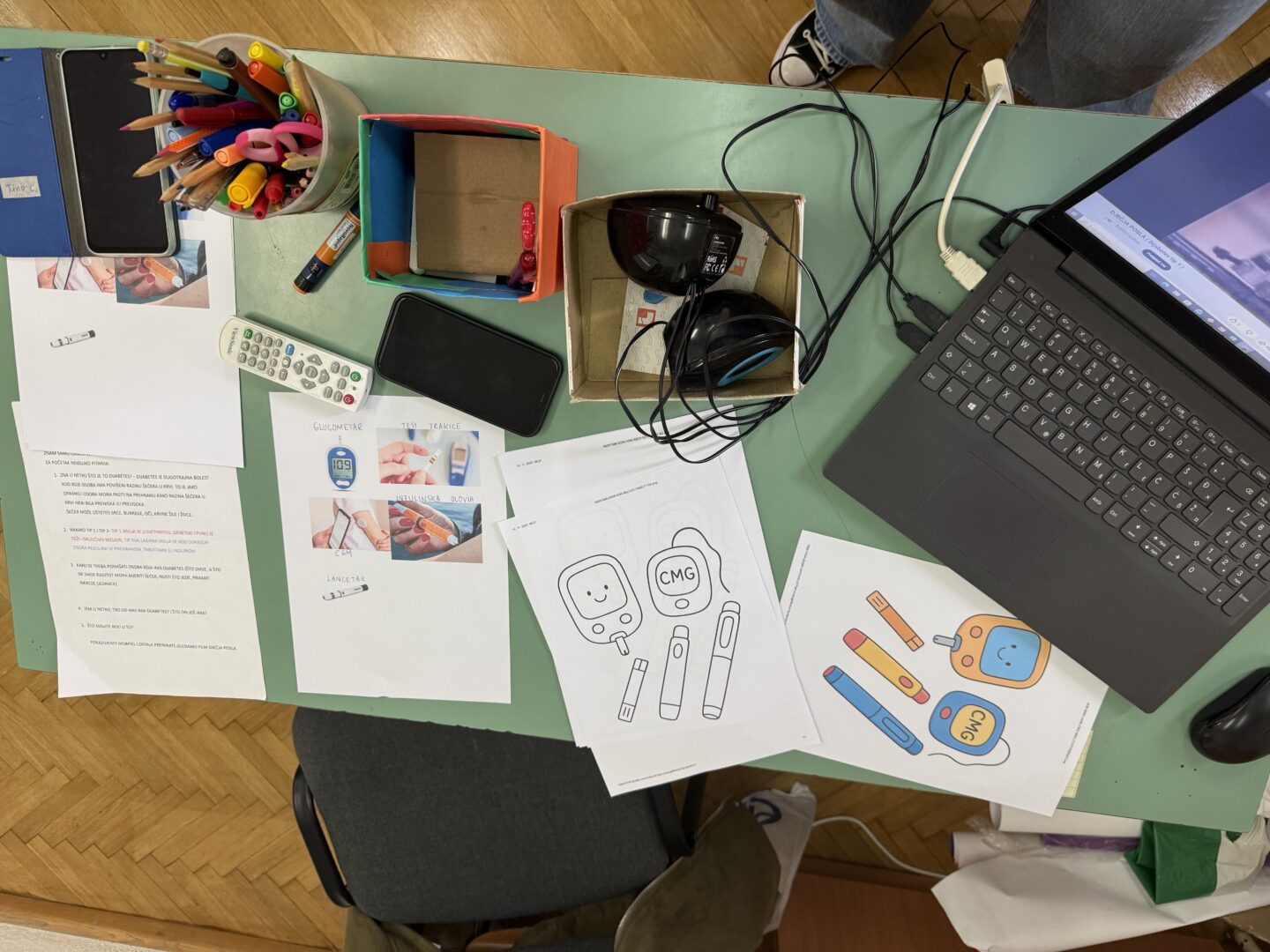U prvom razredu učenici su kroz animirani film i slikovnicu Slatka Ana upoznali ovu bolest, a zatim su im učiteljica Antonija i njihov kolega Roko, čiji brat ima dijabetes, objasnili kako reagirati ako osoba ima nizak ili visok šećer te kako se prati razina šećera putem senzora i glukometrom. Na kraju su učenici bojili bojanke kojima smo uredili naš pano.